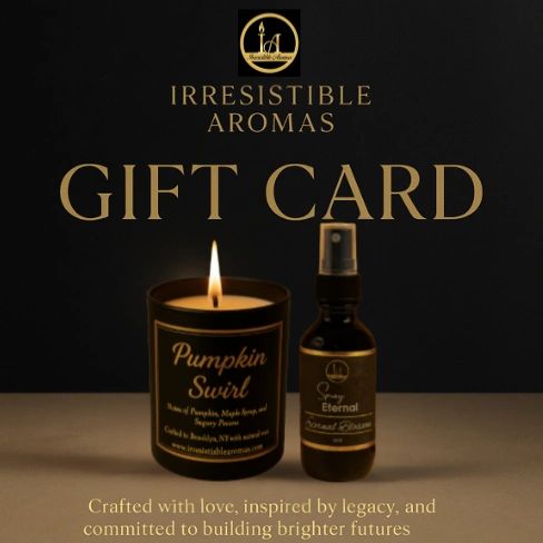 Spread the love for irresistiblearomas.com with our gift cards. A great way to let someone choose their perfect scent and enjoy the experience of our candles, room sprays, and perfumes.